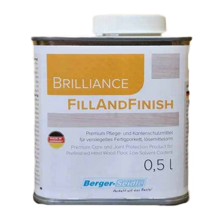Berger - Seidle FILL & FINISH, to środek pielęgnacyjny stworzony specjalnie do przeprowadzenia pierwszej pielęgnacji fabrycznie lakierowanego parkietu warstwowego. Fill-and-Finish zabezpiecza przed wnikaniem wody w niepokryte lakierem płaszczyzny boczne i czoła parkietu gotowego. Głównymi składnikami produktu są modyfikowane oleje rośline i woski. FILL & FINISH różni się od dotychczas stosowanych środków pielęgnacyjnych nie tylko znacznie mniejszą zawartością rozpuszczalników, lecz również sposobem użycia. Przed użyciem należy produkt wypróbować na mniejszej powierzchni.