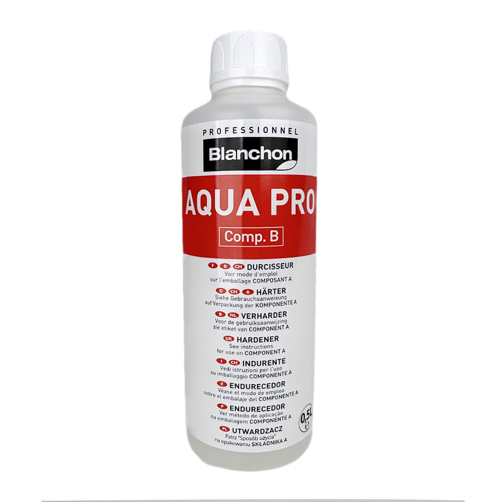 Blanchon Utwardzacz Aqua Pro, to unikalny utwardzacz do olejów - z linii Solid Oil - W proporcji 1:5, oraz lakierów poliuretanowych w fazie wodnej w proporcji 1:10 tj.: Intensiv®, Belmont® NF, Sport®, Blumor® SD, lakier renowacyjny i Aquateinte® 2K. Można go również dodawać do produktu Icerberg™.
