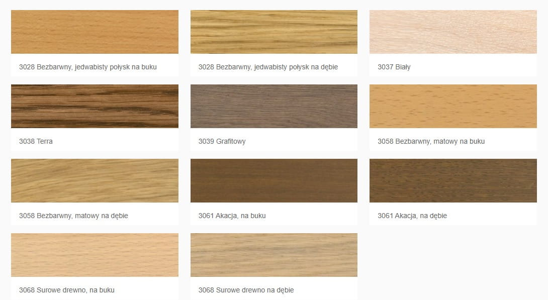 Pokazane zdjęcia próbek uzyskanych przez naniesienie poszczególnych olejów do mebli kuchennych na drewno. Warto jednak pamiętać, że na monitorze mogą wystąpić odchylenia kolorystyczne, a efekt uzyskany w rzeczywistości może różnić się w zależności od gatunku drewna, na które położono powłokę. Dlatego przed malowaniem każdorazowo zaleca się wykonanie próby.